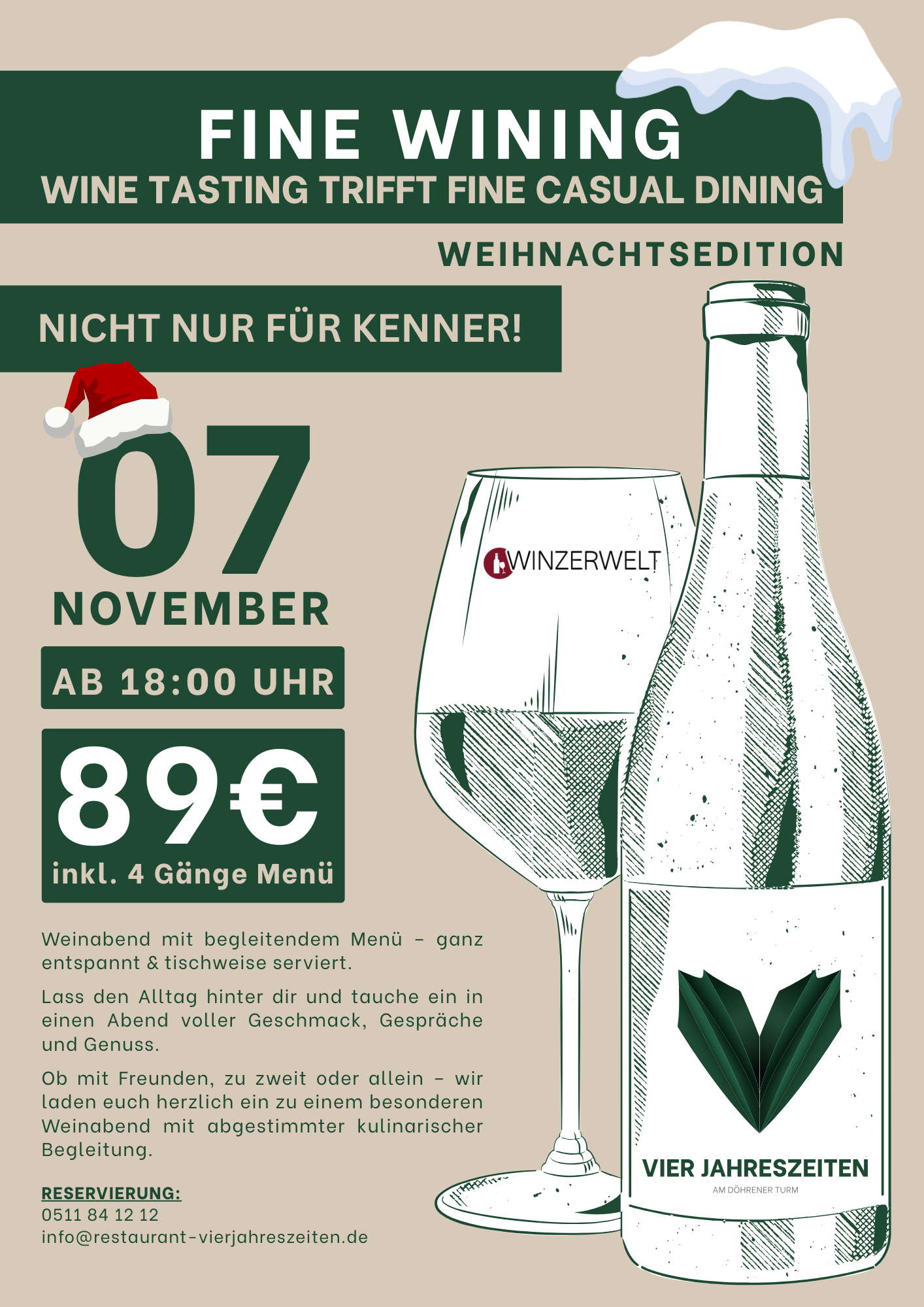 Am Freitag, den 07. November 2025, laden wir euch zur Weihnachtsedition unseres Weinabends ins Vier Jahreszeiten ein.