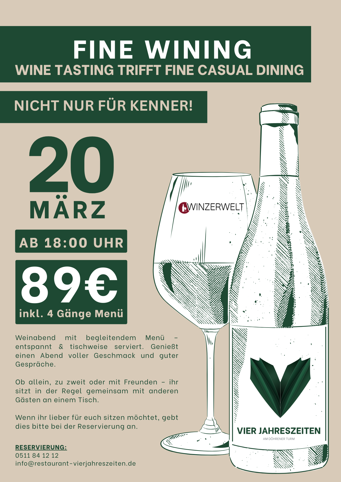 Willkommen im Vier Jahreszeiten, deinem neuen Lieblingsort für unvergessliche Geschmackserlebnisse mitten im Herzen von Hannover. In unserem Restaurant trifft zeitlose Eleganz auf moderne, deutsche Küche, regionale Zutaten auf internationale Inspiration – und Tradition auf frischen Wind.